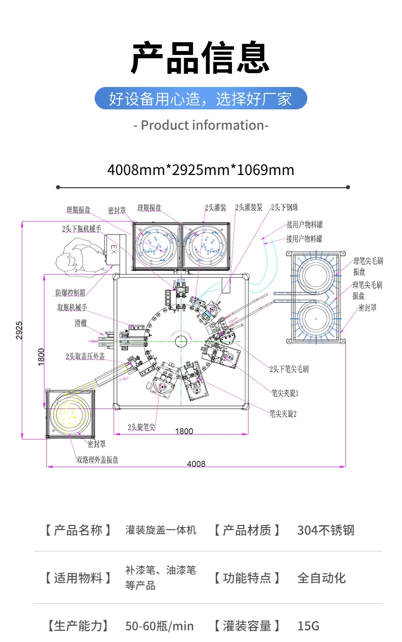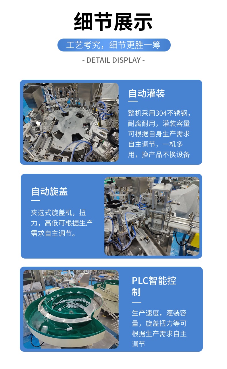 全自動(dòng)灌裝旋蓋下蓋一體機(jī),適用于補(bǔ)漆筆、油漆筆等產(chǎn)品灌裝生產(chǎn),整機(jī)采用灌裝旋蓋一體化設(shè)計(jì),占地面積小,運(yùn)行穩(wěn)定。