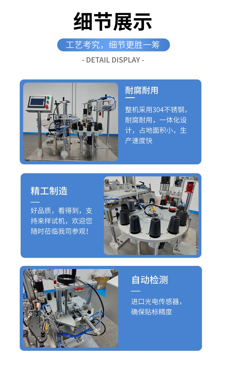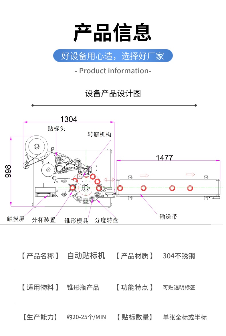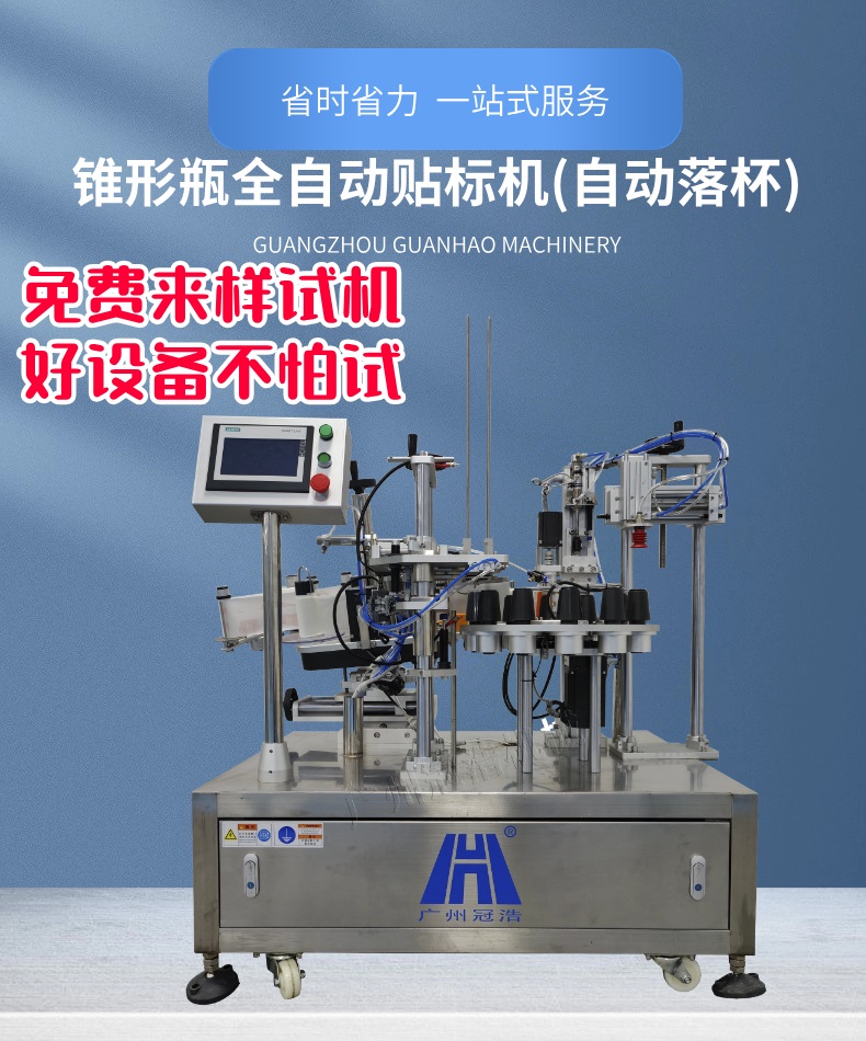 全自動錐形瓶貼標機,應用于食品、飲料、醫藥、農藥等行業在錐形柱體上貼紙標簽。自動落杯-貼標-取杯。整機貼標采用304耐腐耐用不銹鋼。