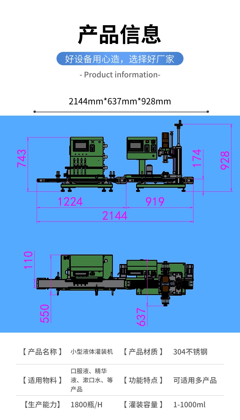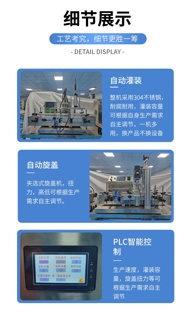 小型液體灌裝生產線適用于10-1000ML的液體物料,應用于生物制藥、食品、日化等多行業。整機占地面積小,可以直接擺在桌子上的灌裝生產線。特別適合工作室、實驗室、小規模生產的企業。支持免費來樣試機!