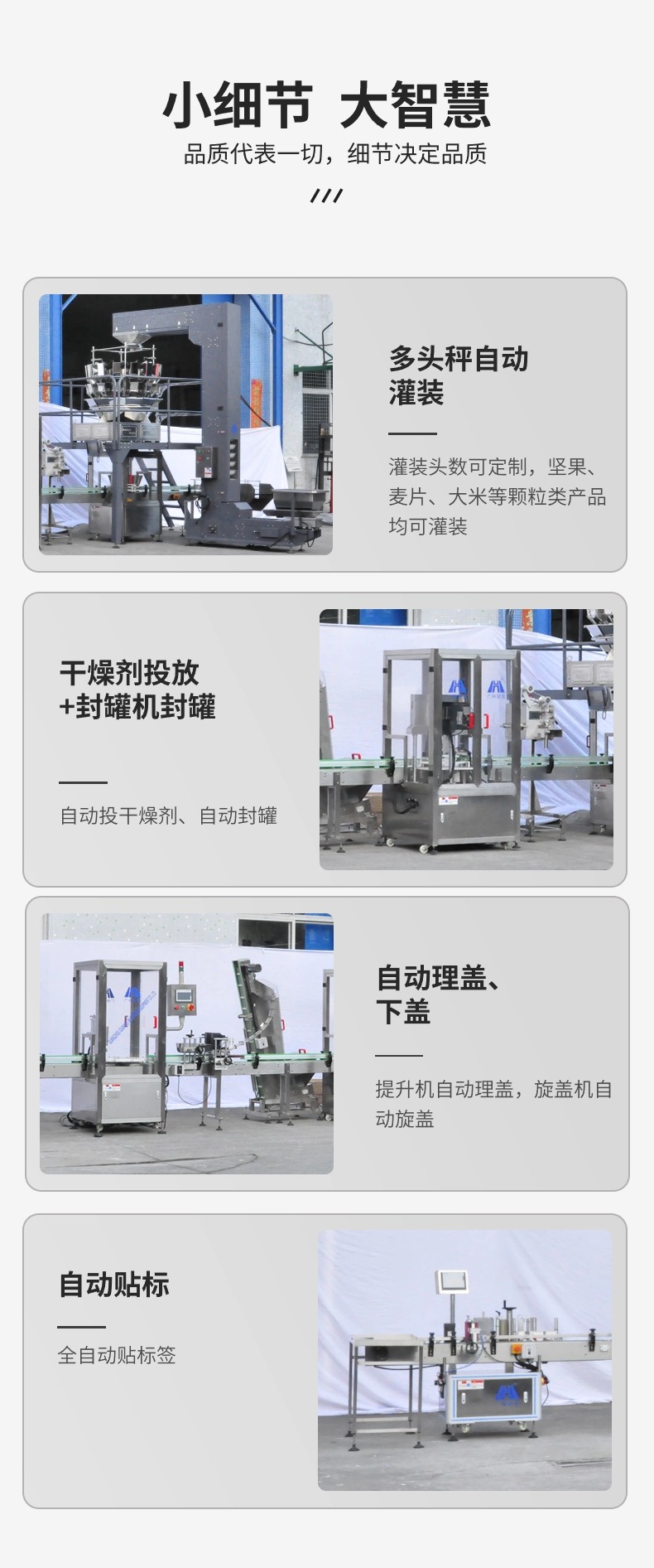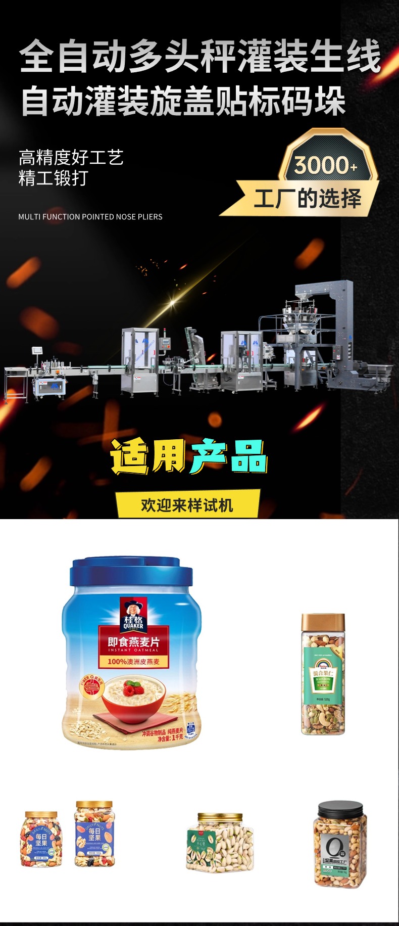全自動多頭秤顆粒灌裝生產線,適用于堅果、零食、雜糧等顆粒類產品灌裝生產,多頭秤高精度稱重灌裝。自動鎖蓋機封蓋等。