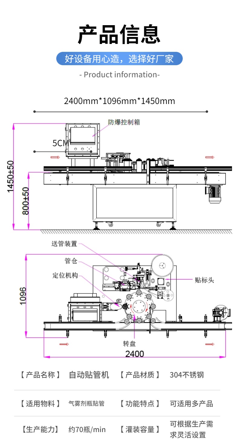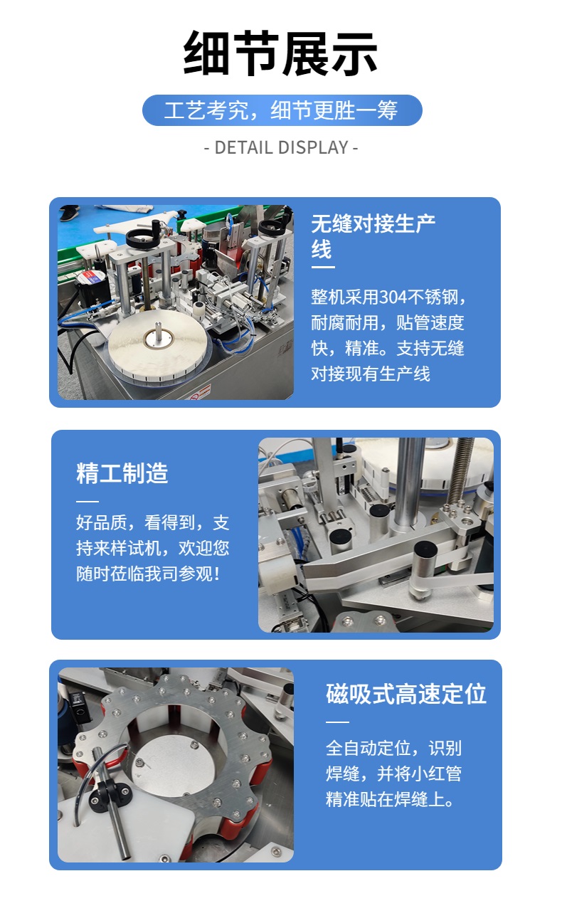 全自動氣霧劑貼管機是我司的專利設備,獲得國家頒發的發明專利證書。該設備專用于氣霧劑小紅管導管貼管子用,將紅色的管子通過精準定位,粘貼到氣霧劑瓶的焊縫上。可以節省大量的人力成本。