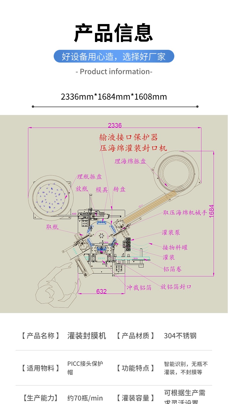 該設備專用于PICC接口保護帽等醫療產品設計生產,整機采用灌裝封口一體化設計,占地面積小,運行穩定。采用實時高精密沖模,取鋁膜。支持免費來樣試機哦......