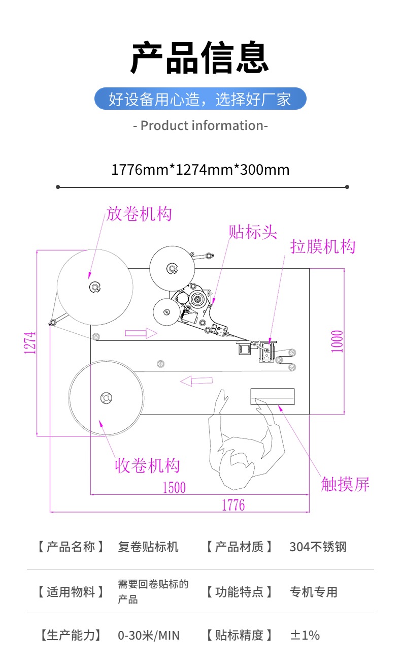 自動貼標(biāo)機,復(fù)卷貼標(biāo)機設(shè)備。該設(shè)備專用于成卷標(biāo)簽需要貼標(biāo)并回卷的產(chǎn)品。